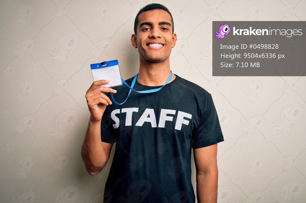 Young handsome african american worker man wearing staff uniform holding id card with a happy face standing and smiling with a confident smile showing teeth - Kraken Images