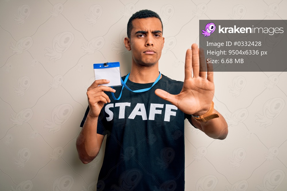 Young handsome african american worker man wearing staff uniform holding id card with open hand doing stop sign with serious and confident expression, defense gesture - Kraken Images