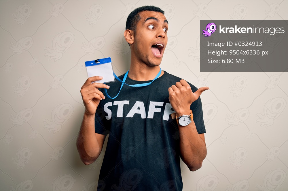Young handsome african american worker man wearing staff uniform holding id card pointing and showing with thumb up to the side with happy face smiling - Kraken Images