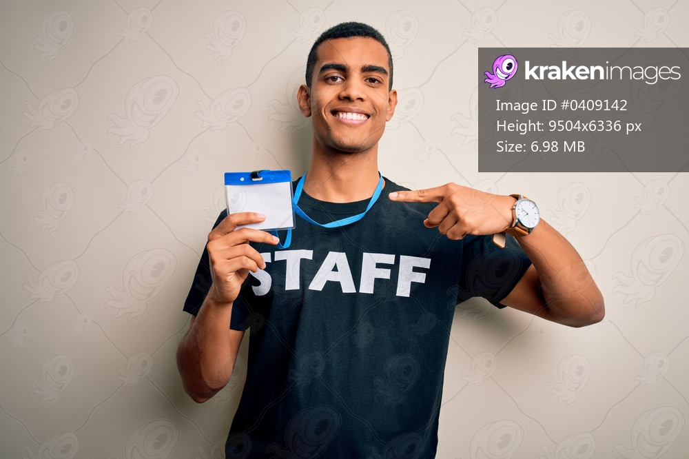 Young handsome african american worker man wearing staff uniform holding id card with surprise face pointing finger to himself