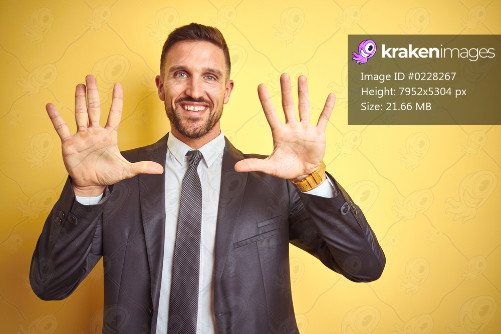 Young handsome business man over yellow isolated background showing and pointing up with fingers number ten while smiling confident and happy.
