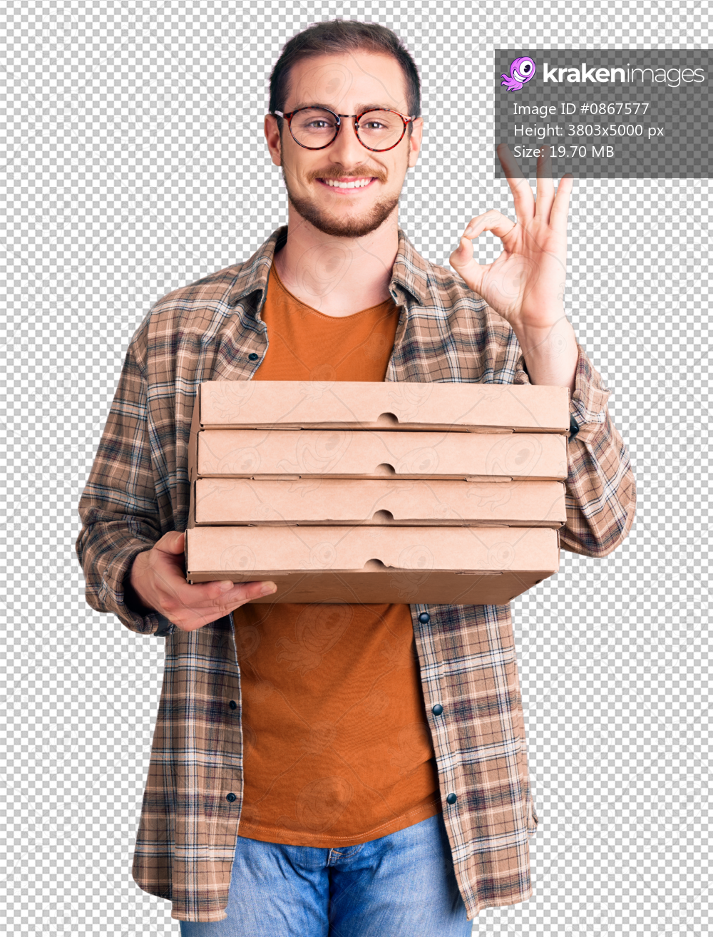 Young handsome caucasian man holding delivery pizza box doing ok sign with fingers, smiling friendly gesturing excellent symbol