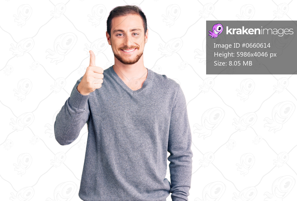 Young handsome caucasian man wearing casual winter sweater smiling happy and positive, thumb up doing excellent and approval sign