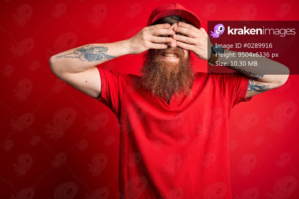 Young handsome delivery man wearing glasses and red cap over isolated background covering eyes with hands smiling cheerful and funny. Blind concept.