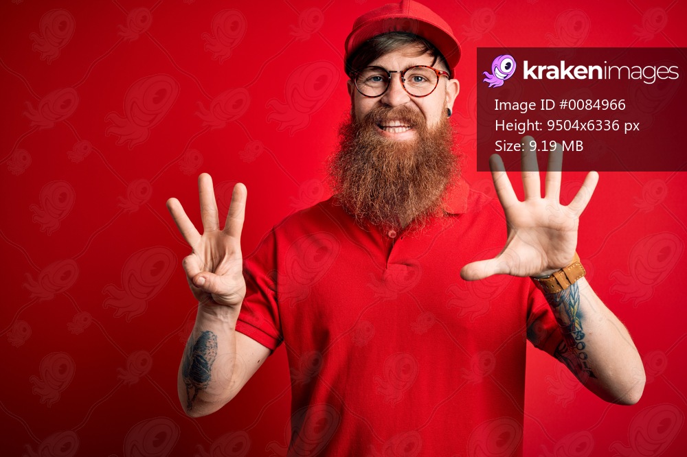 Young handsome delivery man wearing glasses and red cap over isolated background showing and pointing up with fingers number eight while smiling confident and happy. - Kraken Images