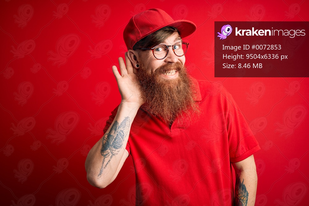 Young handsome delivery man wearing glasses and red cap over isolated background smiling with hand over ear listening an hearing to rumor or gossip. Deafness concept. - Kraken Images