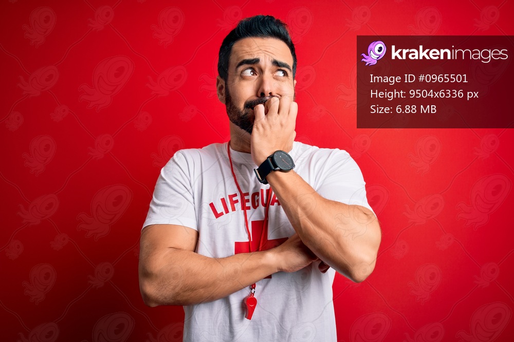 Young handsome lifeguard man with beard wearing whistle over isolated red background looking stressed and nervous with hands on mouth biting nails. Anxiety problem. - Kraken Images