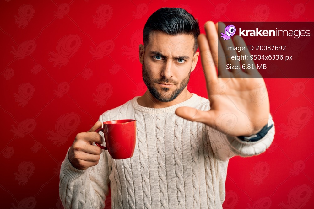 Young handsome man drinking a cup of hot coffee over red isolated background with open hand doing stop sign with serious and confident expression, defense gesture - Kraken Images