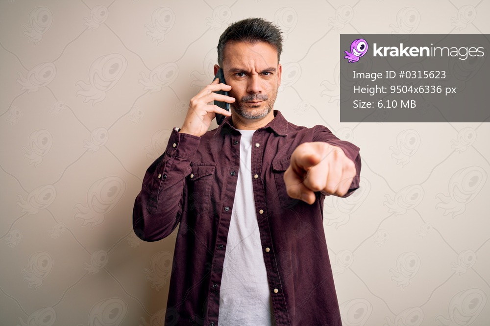 Young handsome man having conversation talking on the smartphone over white background pointing with finger to the camera and to you, hand sign, positive and confident gesture from the front - Kraken Images