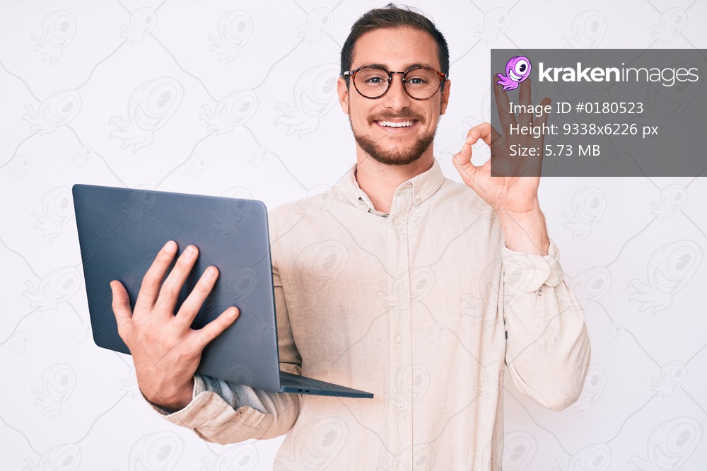 Young handsome man holding laptop doing ok sign with fingers, smiling friendly gesturing excellent symbol