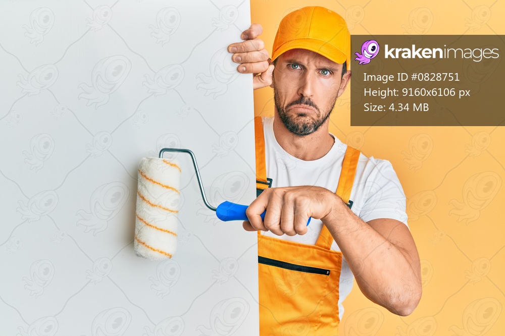 Young handsome man holding roller painter over white banner depressed and worry for distress, crying angry and afraid. sad expression.