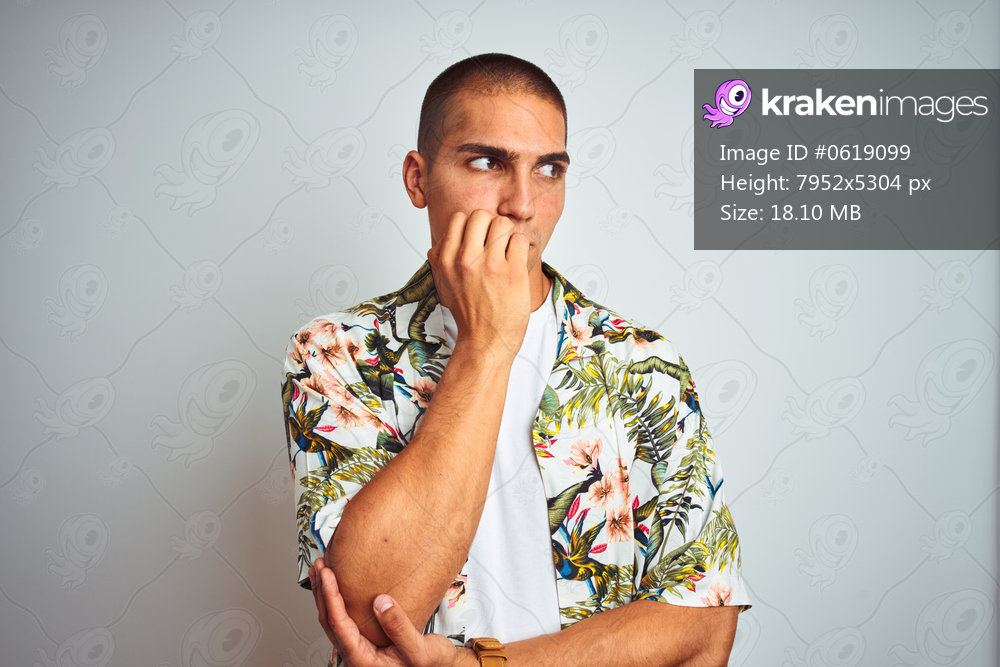 Young handsome man on holidays wearing Hawaiian shirt over white background looking stressed and nervous with hands on mouth biting nails. Anxiety problem. - Kraken Images