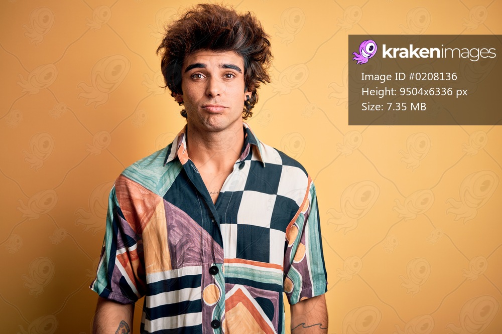 Young handsome man on vacation wearing summer shirt over isolated yellow background depressed and worry for distress, crying angry and afraid. Sad expression. - Kraken Images