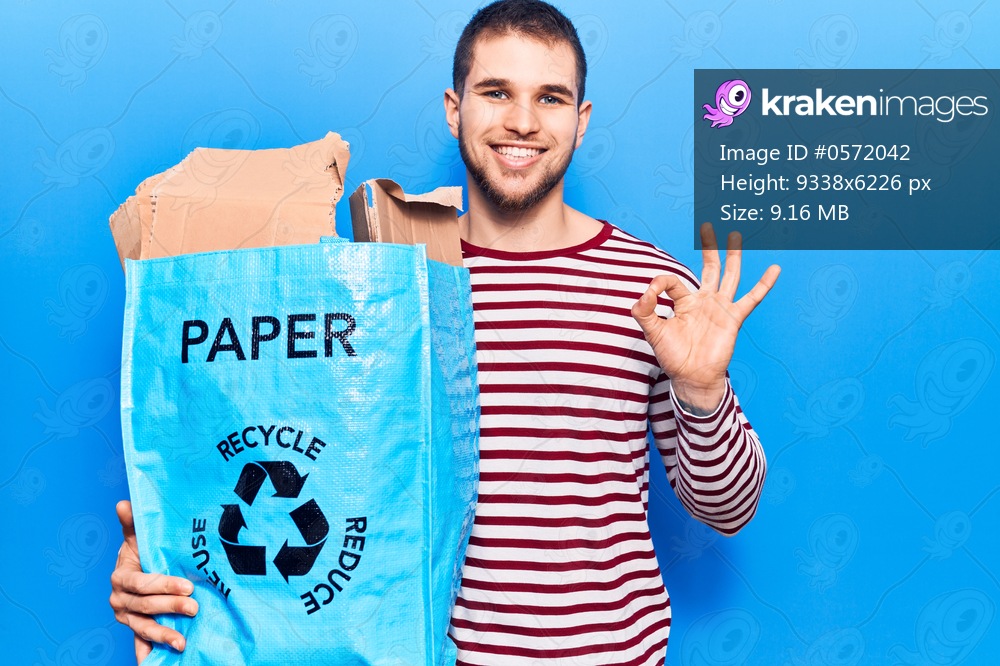 Young handsome man recycling paper doing ok sign with fingers, smiling friendly gesturing excellent symbol
