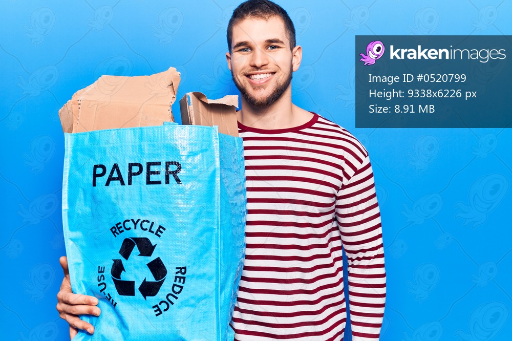Young handsome man recycling paper looking positive and happy standing and smiling with a confident smile showing teeth