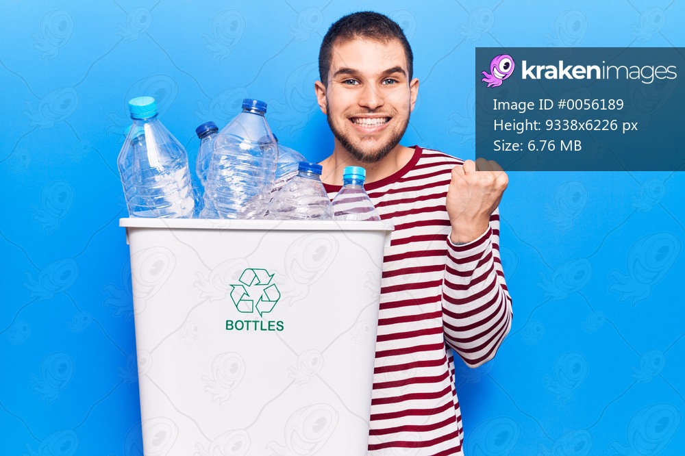 Young handsome man recycling plastic bottles screaming proud, celebrating victory and success very excited with raised arm