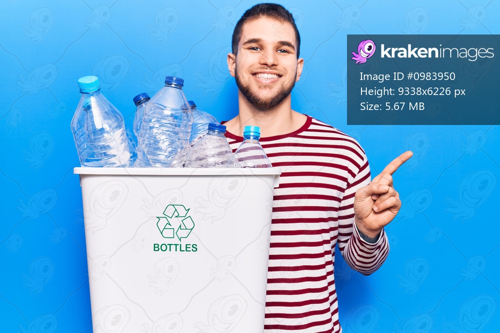 Young handsome man recycling plastic bottles smiling happy pointing with hand and finger to the side