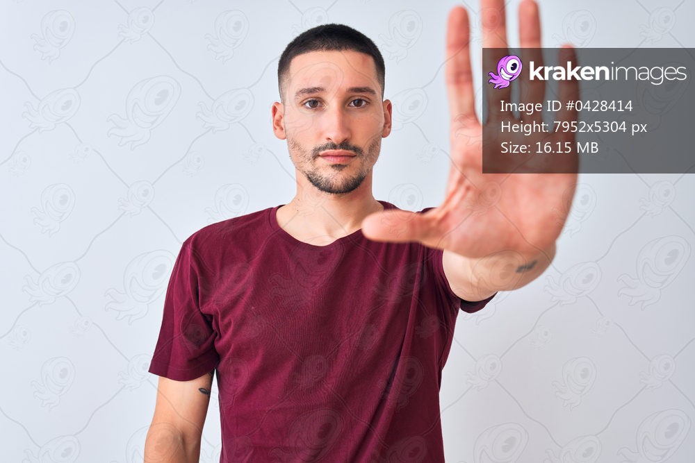 Young handsome man standing over isolated background doing stop sing with palm of the hand. Warning expression with negative and serious gesture on the face. - Kraken Images