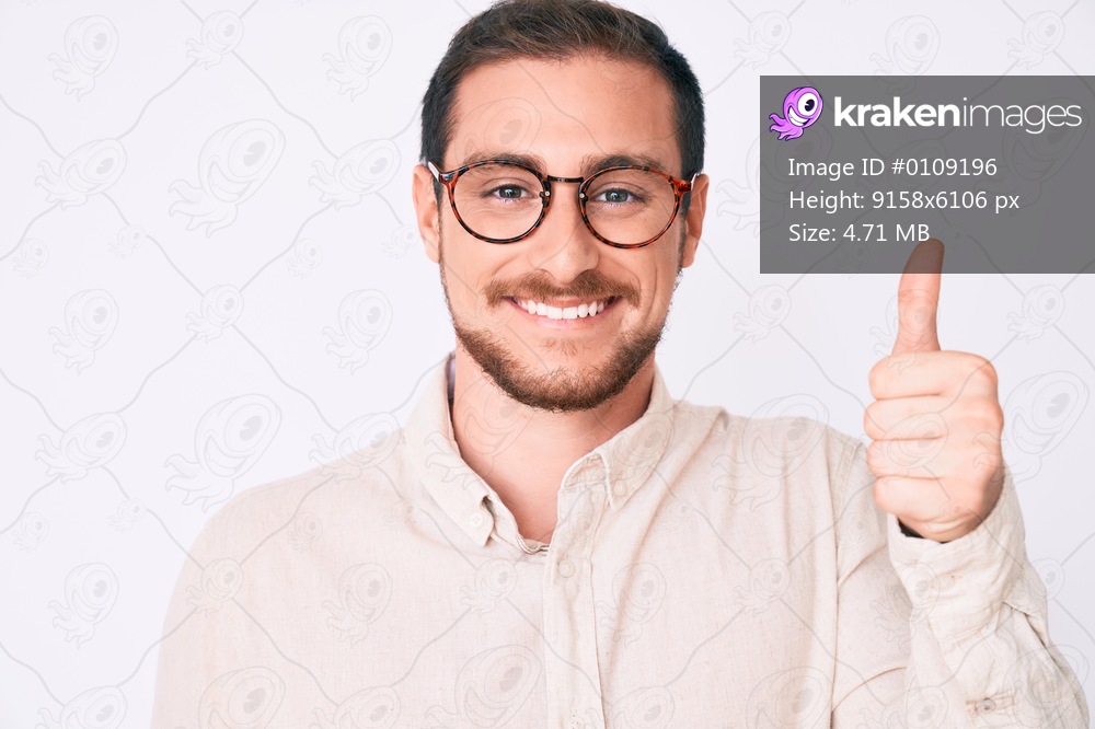 Young handsome man wearing casual clothes and glasses smiling happy and positive, thumb up doing excellent and approval sign