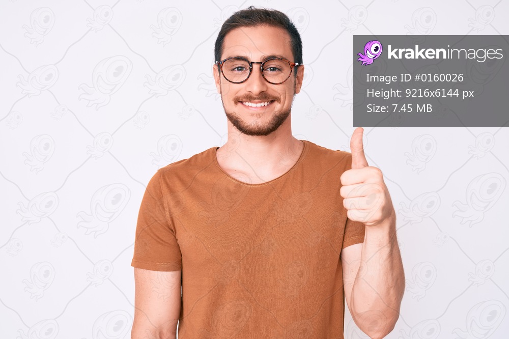 Young handsome man wearing casual clothes and glasses smiling happy and positive, thumb up doing excellent and approval sign