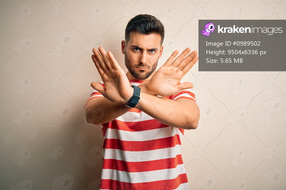Young handsome man wearing casual striped t-shirt standing over isolated white background Rejection expression crossing arms and palms doing negative sign, angry face - Kraken Images