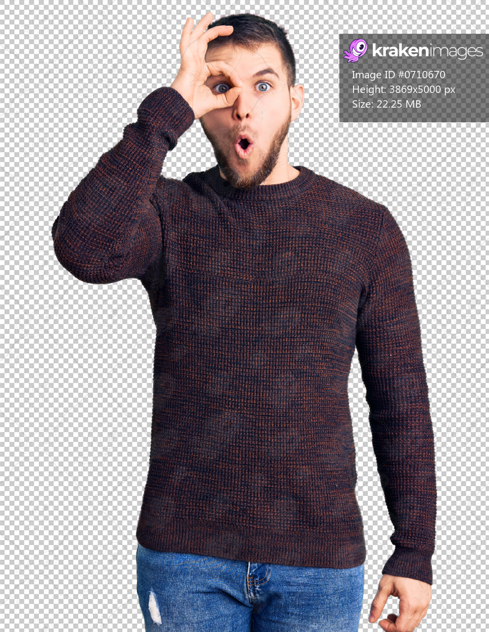 Young handsome man wearing casual sweater doing ok gesture shocked with surprised face, eye looking through fingers. unbelieving expression.