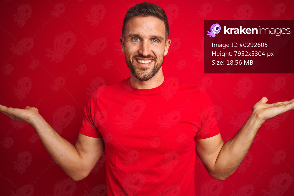 Young handsome man wearing casual t-shirt over red isolated background smiling showing both hands open palms, presenting and advertising comparison and balance - Kraken Images
