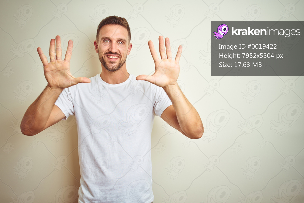 Young handsome man wearing casual white t-shirt over isolated background showing and pointing up with fingers number ten while smiling confident and happy. - Kraken Images