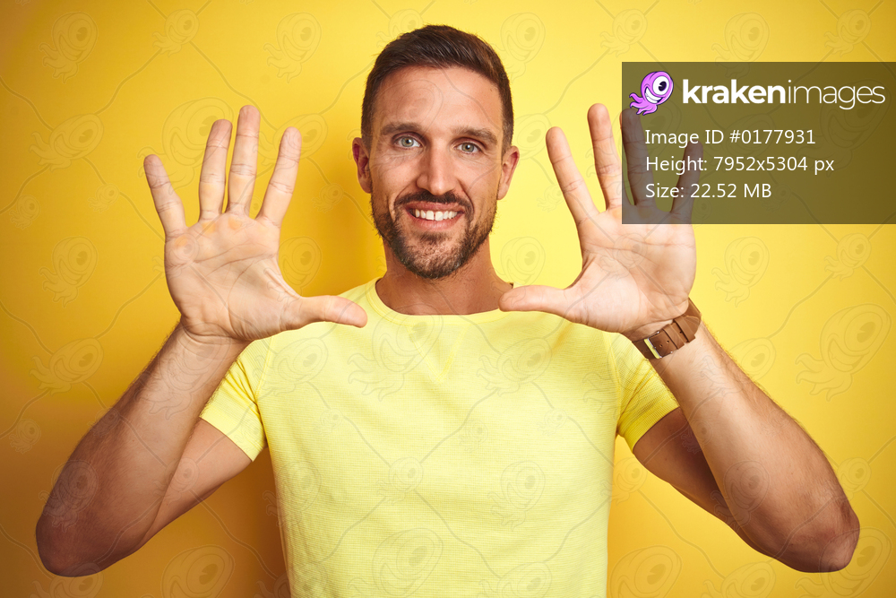 Young handsome man wearing casual yellow t-shirt over yellow isolated background showing and pointing up with fingers number ten while smiling confident and happy. - Kraken Images