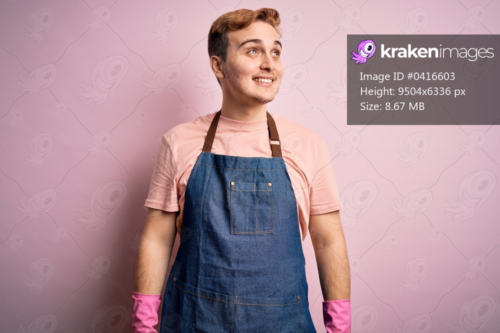 Young handsome redhead cleaner man doing housework wearing apron and gloves looking away to side with smile on face, natural expression. Laughing confident. - Kraken Images