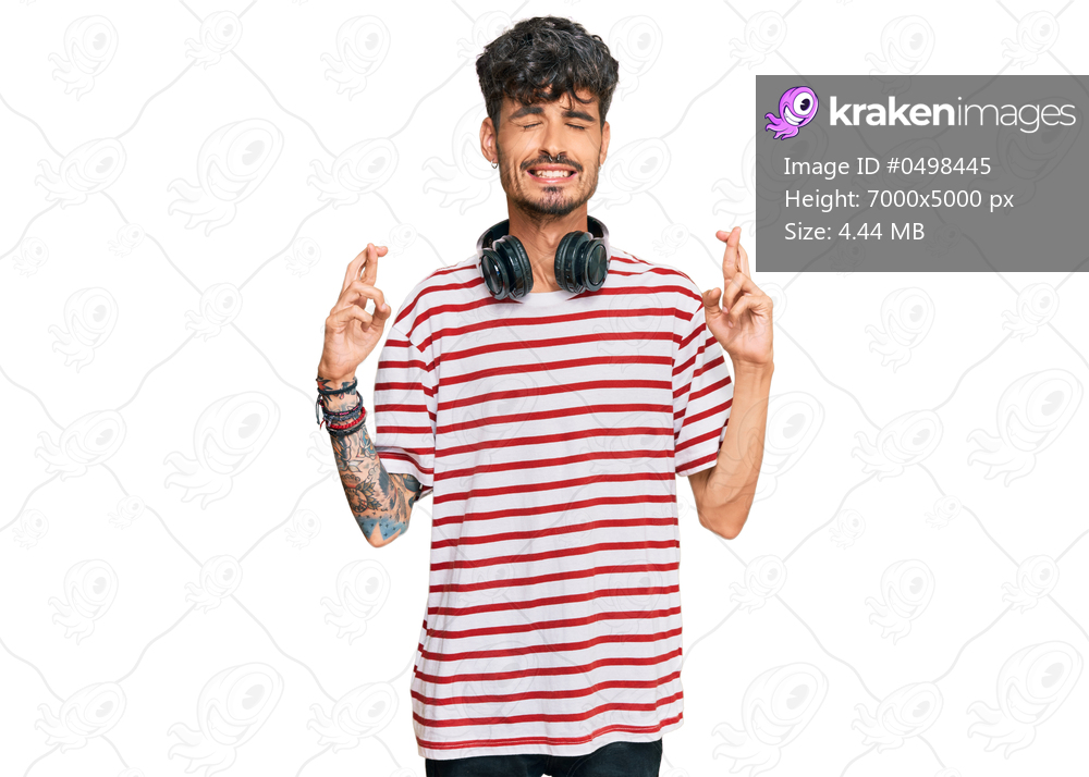 Young hispanic man listening to music using headphones gesturing finger crossed smiling with hope and eyes closed. luck and superstitious concept.