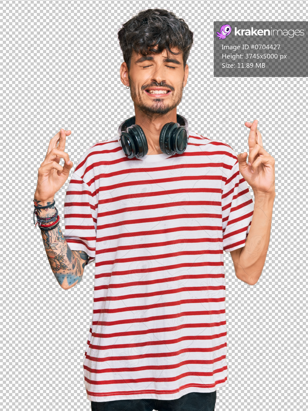 Young hispanic man listening to music using headphones gesturing finger crossed smiling with hope and eyes closed. luck and superstitious concept.