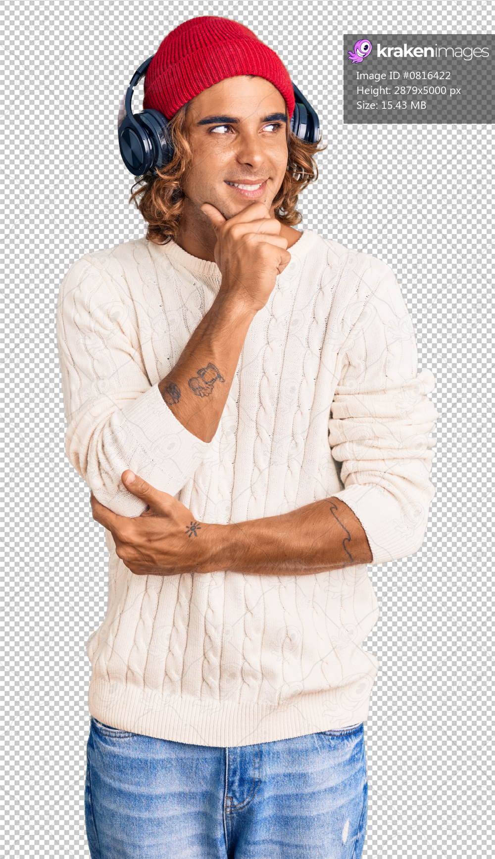Young hispanic man listening to music using headphones with hand on chin thinking about question, pensive expression. smiling with thoughtful face. doubt concept. - Kraken Images