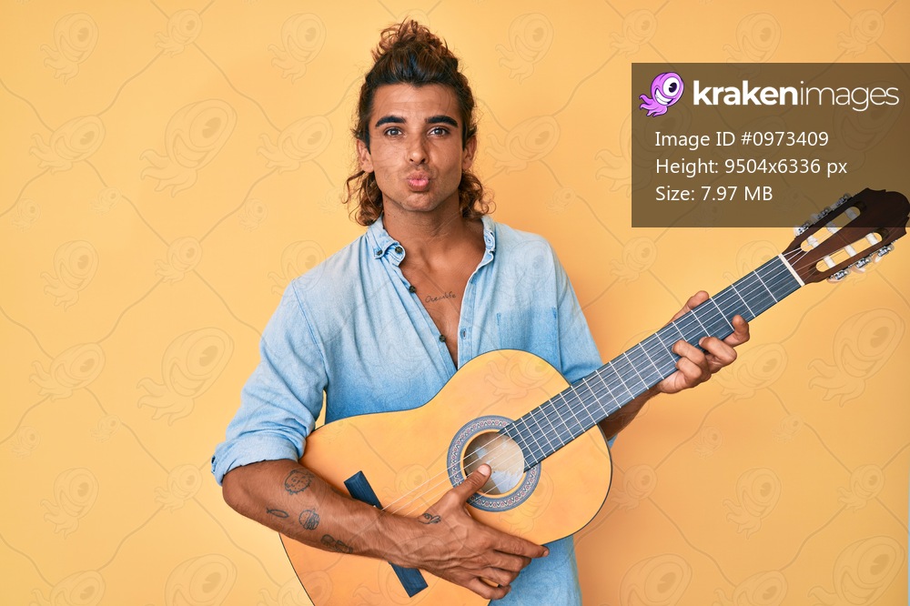 Young hispanic man playing classical guitar looking at the camera blowing a kiss being lovely and sexy. love expression.