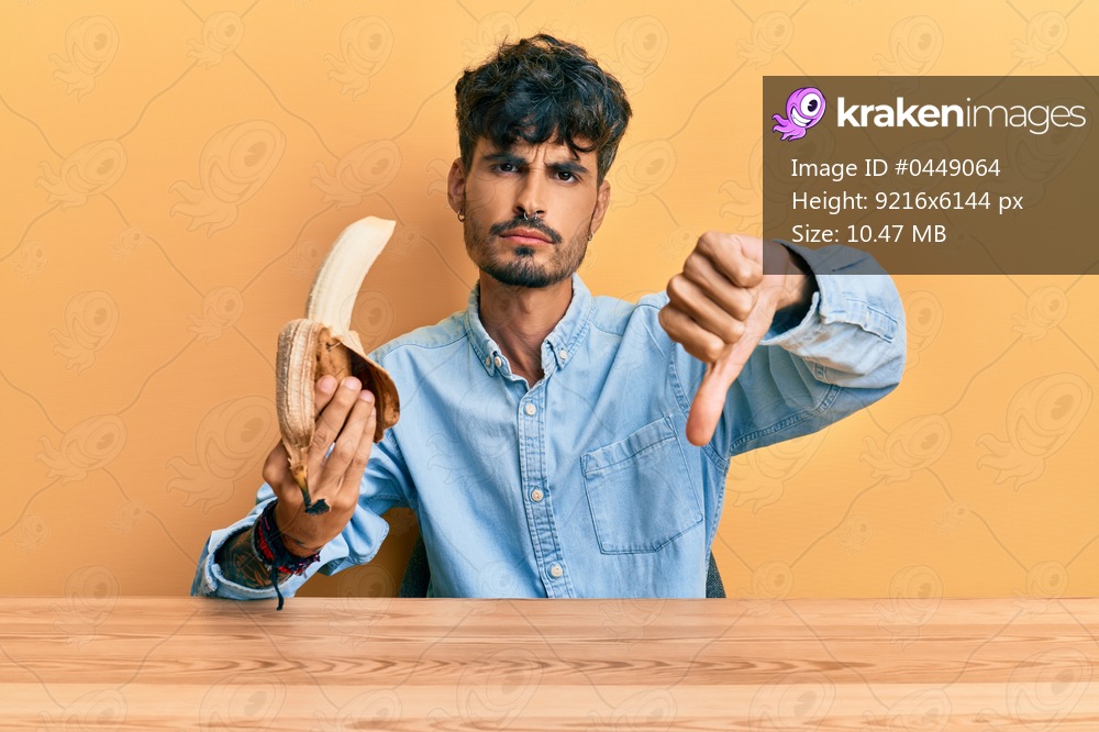 Young hispanic man sitting on the table holding banana with angry face, negative sign showing dislike with thumbs down, rejection concept