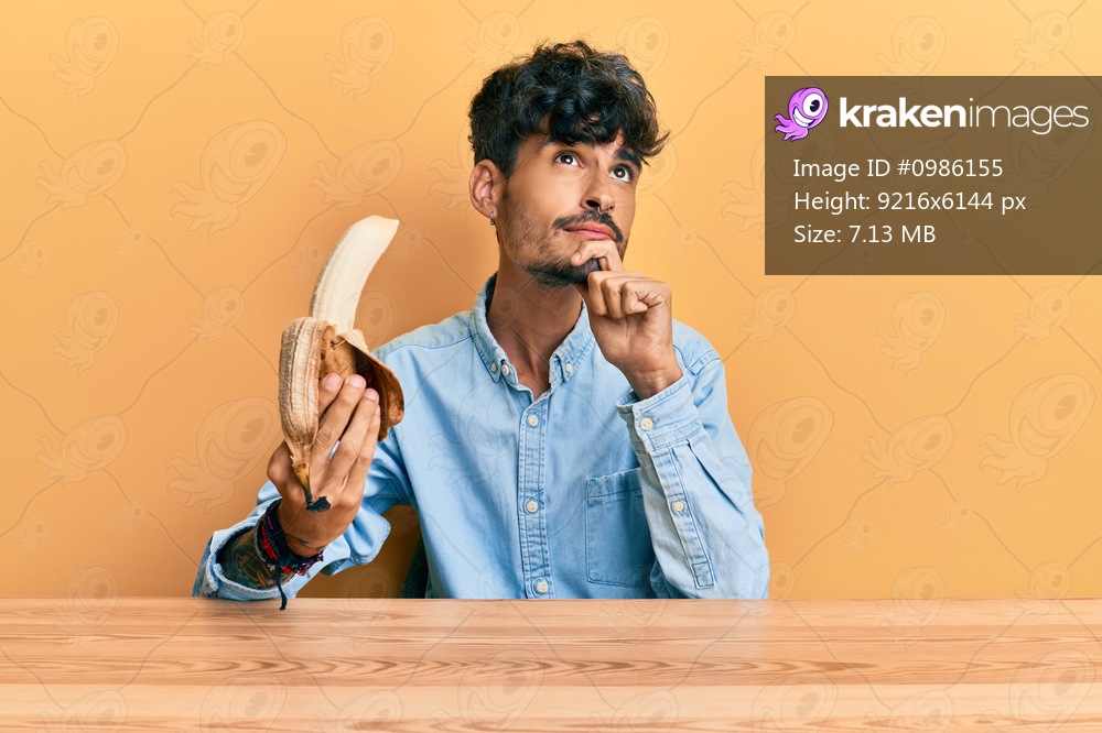 Young hispanic man sitting on the table holding banana serious face thinking about question with hand on chin, thoughtful about confusing idea