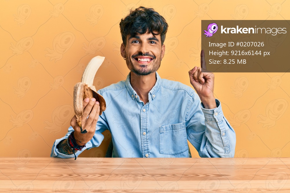 Young hispanic man sitting on the table holding banana surprised with an idea or question pointing finger with happy face, number one