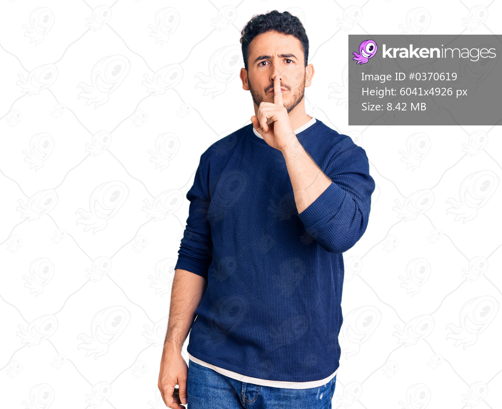 Young hispanic man wearing casual clothes asking to be quiet with finger on lips. silence and secret concept.