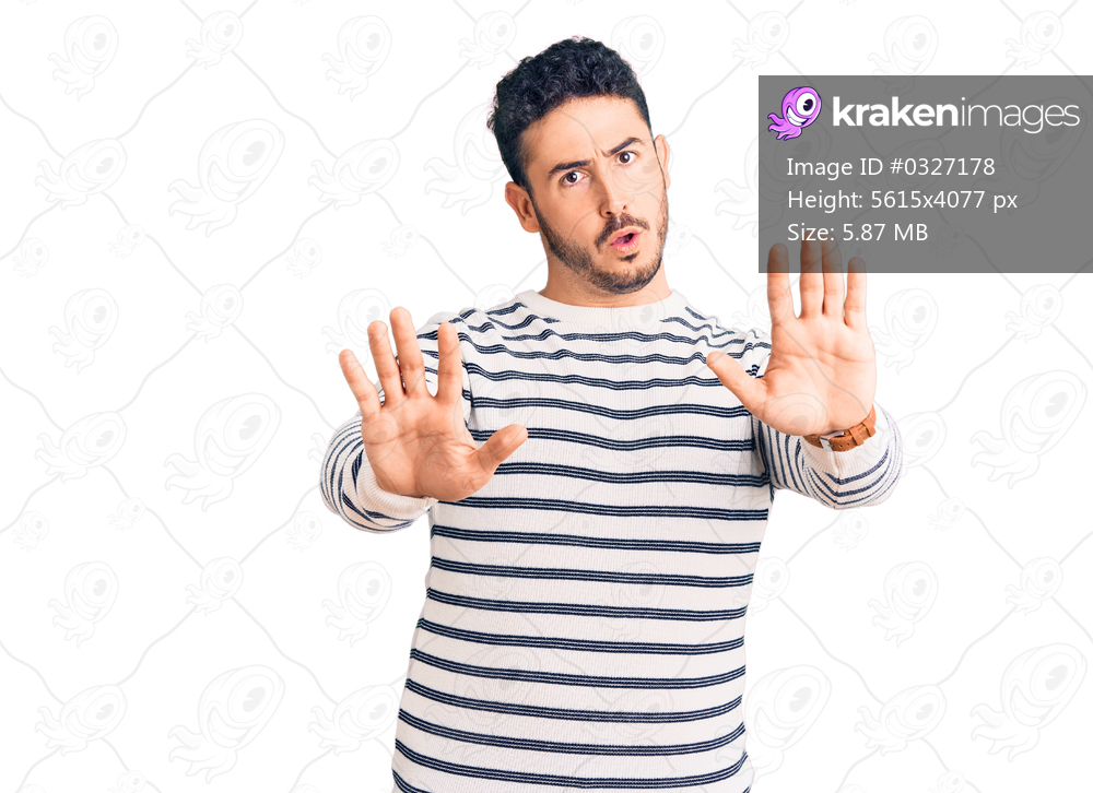 Young hispanic man wearing casual clothes doing stop gesture with hands palms, angry and frustration expression