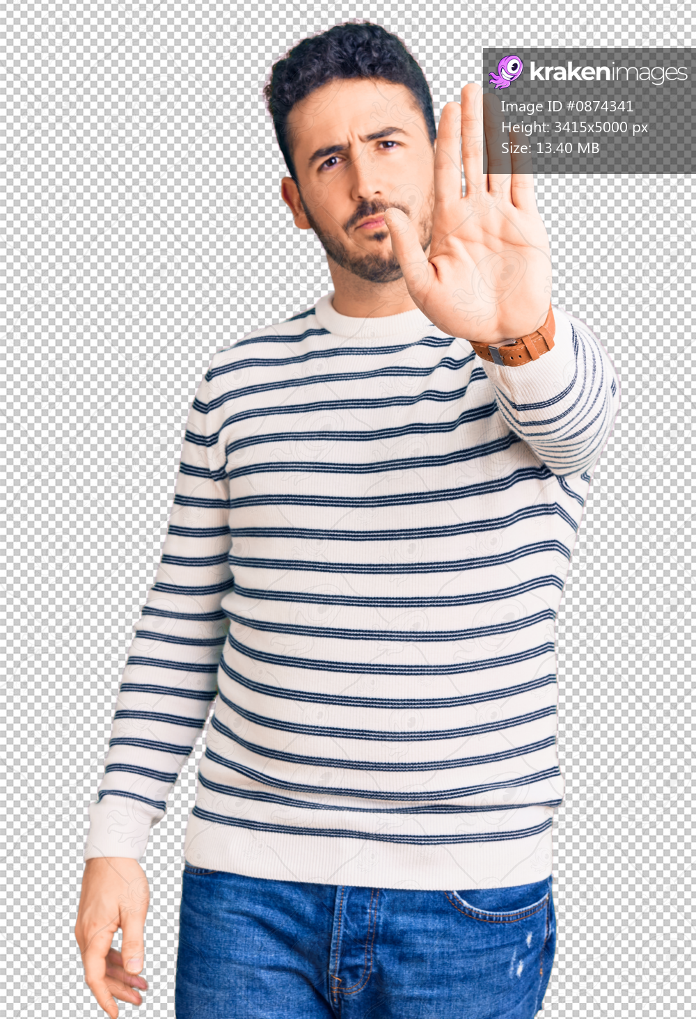 Young hispanic man wearing casual clothes doing stop sing with palm of the hand. warning expression with negative and serious gesture on the face.