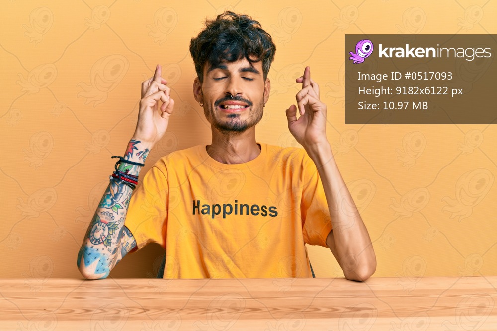 Young hispanic man wearing tshirt with happiness word message sitting on the table gesturing finger crossed smiling with hope and eyes closed. luck and superstitious concept. - Kraken Images
