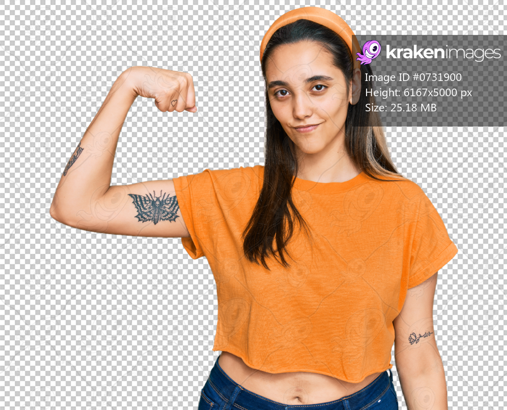 Young hispanic woman wearing casual clothes strong person showing arm muscle, confident and proud of power