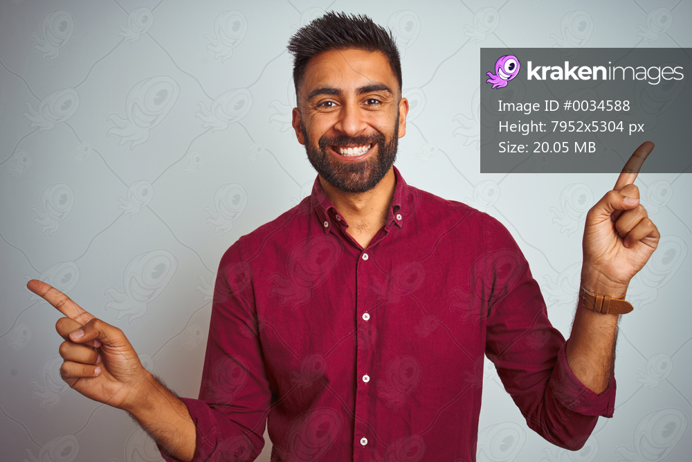 Young indian man wearing red elegant shirt standing over isolated grey background smiling confident pointing with fingers to different directions. Copy space for advertisement - Kraken Images
