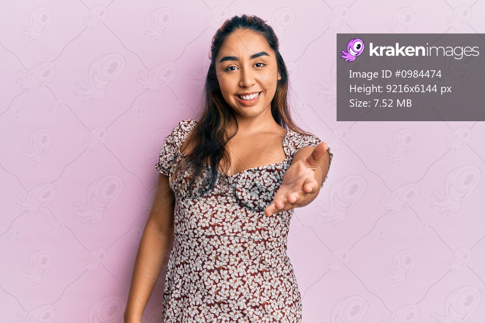 Young latin woman wearing casual clothes smiling friendly offering handshake as greeting and welcoming. successful business.
