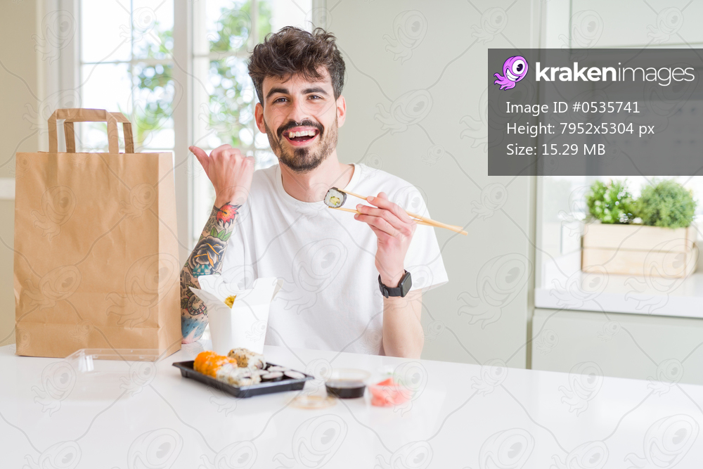 Young man eating asian sushi from home delivery pointing and showing with thumb up to the side with happy face smiling