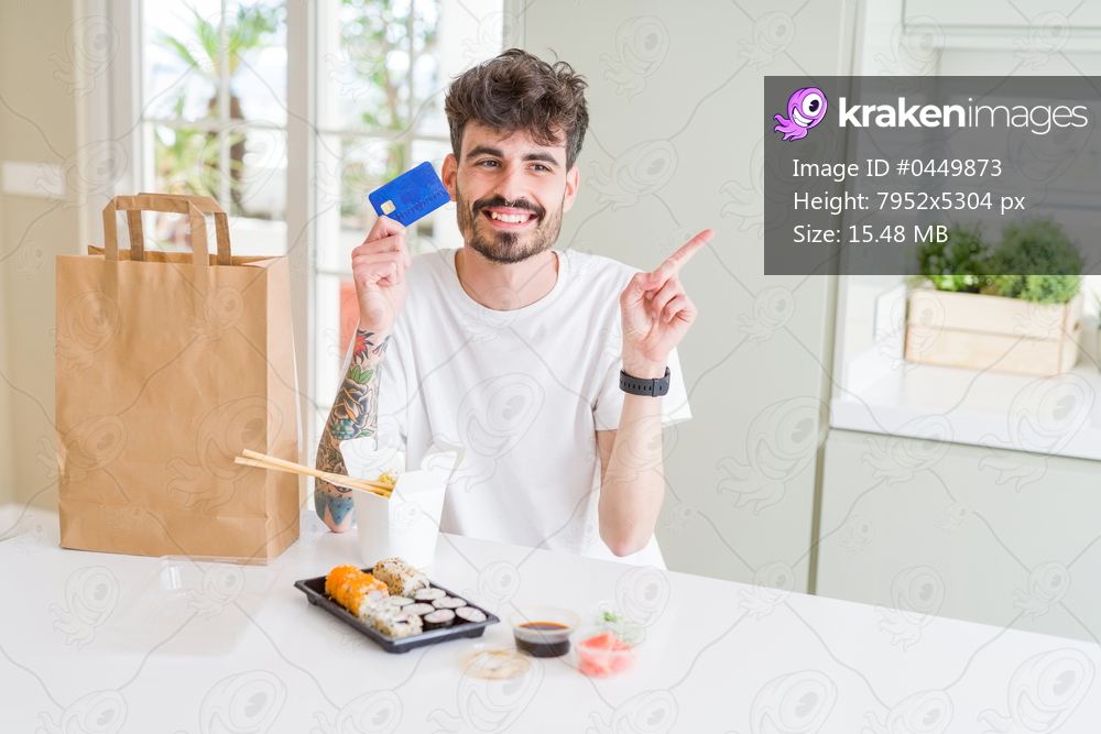 Young man eating asian sushi from home delivery using credit card as payment very happy pointing with hand and finger to the side