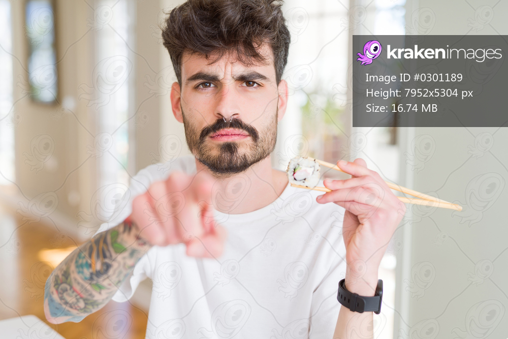 Young man eating asian sushi using chopsticks pointing with finger to the camera and to you, hand sign, positive and confident gesture from the front
