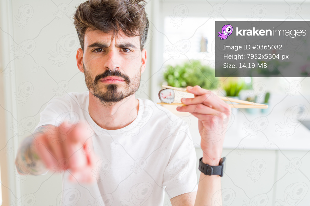 Young man eating asian sushi using chopsticks pointing with finger to the camera and to you, hand sign, positive and confident gesture from the front