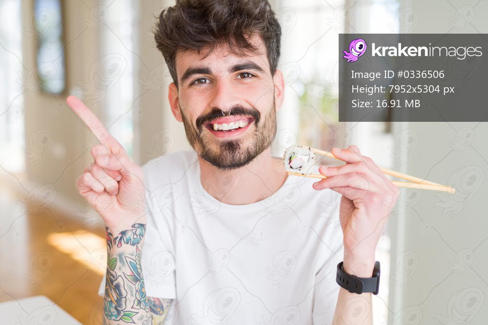 Young man eating asian sushi using chopsticks very happy pointing with hand and finger to the side