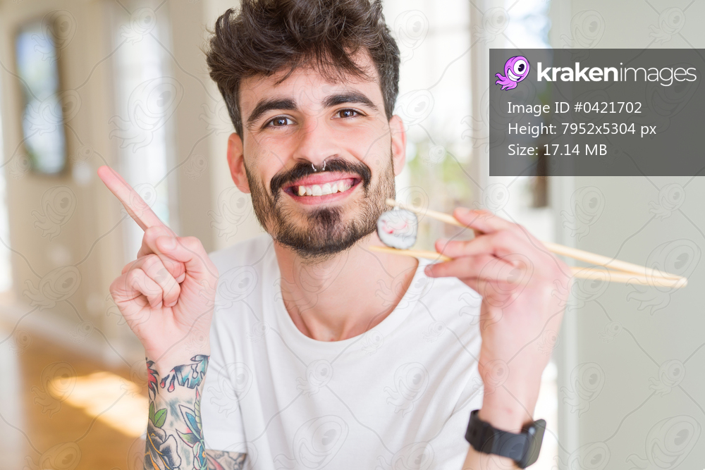 Young man eating asian sushi using chopsticks very happy pointing with hand and finger to the side